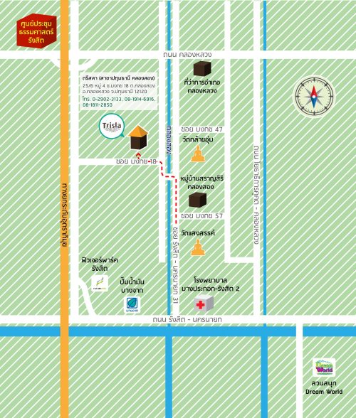 ข้าซอยบงกช 18 (ตรงข้ามวัดกล้าชอุ่ม) ประมาณ 150 เมตร 25/6 หมู่ 4 ซอยบงกช 18, ต. คลองสอง อ. คลองหลวง จ. ปทุมธานี 12120 โทร. 0-2902-3133, 08-1914-6916, 08-1811-2850